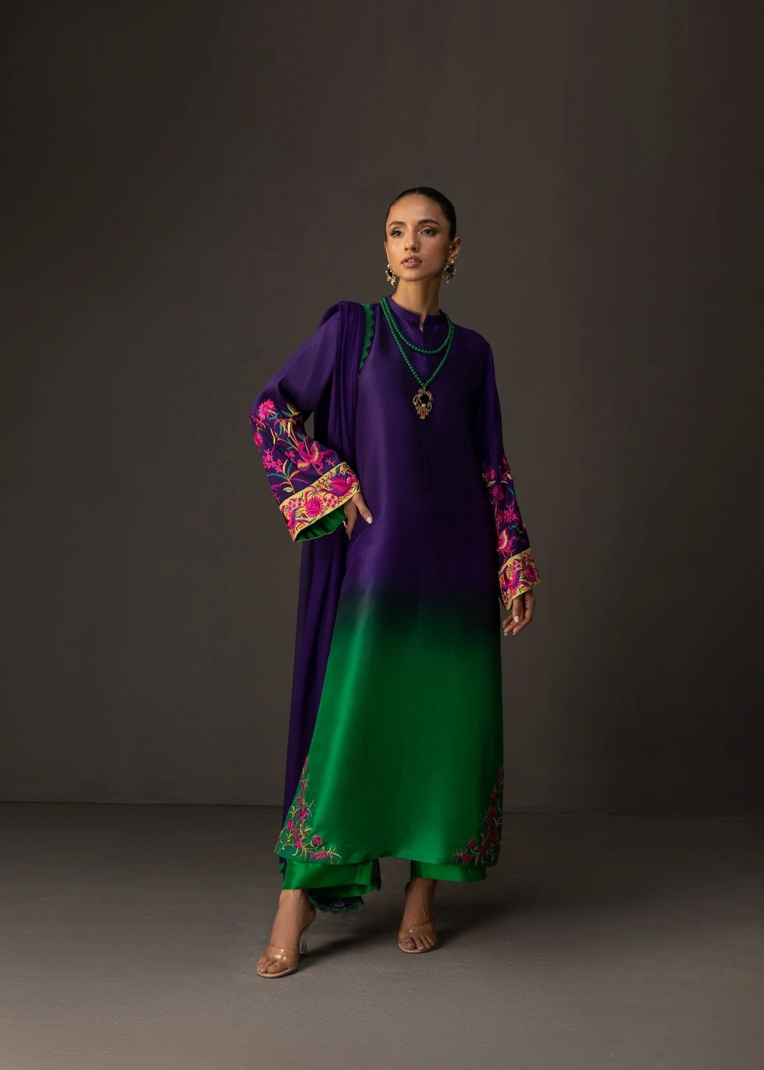 Additional Description: Embrace the vibrant hues of our gradient ensemble, where sun-kissed yellow seamlessly transitions into a radiant magenta. This long shirt is elevated by intricate black embroidery, creating a striking contrast against the bold colors. The matching dupatta, adorned with delicate black detailing, completes this festive look.